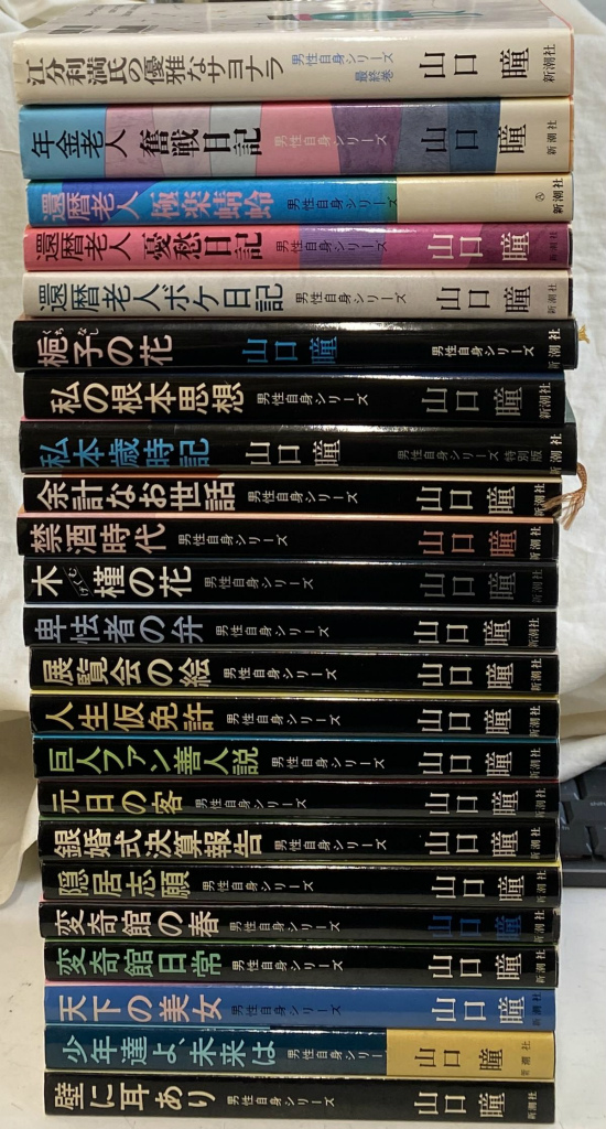 「壁に耳あり」「少年達よ、未来は」「天下の美女」「変奇館日常」「変奇館の春」「隠居志願」「銀婚式決算報告」「元日の客」「巨人ファン善人説」「人生仮免許」「展覧会の絵」「卑怯者の弁」「木槿の花」「禁酒時代」「余計なお世話」「私本歳時記」「私の根本思想」「梔子の花」「還暦老人ボケ日記」「還暦老人憂愁日記」「還暦老人極楽蜻蛉」「年金老人奮闘日記」「江戸利満氏の優雅なサヨナラ」の23冊 カバー 梔子の花、江戸利満氏の優雅なサヨナラ、小口にヨゴレ、13,200円 、縦19cm 、出版元:新潮社 、刊行年:昭和44 、テーマ:エッセー 、状態:良好(極美/美/良好/並下/難の5段階) 、在庫ID:243915 、冊数:23